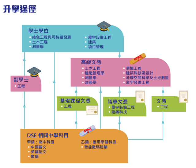 建造業目前正渴求大量具備新科技知識的多元人才,尤其是在BIM及綠色建築等專業領域。他表示,「建造業作為實幹型行業,無論是大型基建、新建工程項目,乃至樓宇維修,都需要源源不絕的專才支援。市場對新一代建造業人才的要求,除了要掌握傳統建築知識外,還需要緊貼科技發展趨勢,按個人興趣在BIM或綠色建築等專業範疇,繼續進修發展,進一步提升專業能力。」鄧智宏又以自身經歷分享,他早年先在VTC修讀建築學文憑課程,其後負笈海外取得學士學位,回港後一邊工作一邊考取測量師等專業資格,成功由技術員晉升至專業人士。他的經歷充分證明,只要有清晰的目標和持續的努力,透過職業專才教育,這條專業發展階梯是切實可行。